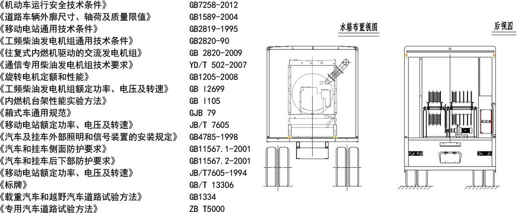 电源车作为应急电源,除了具有固定式开云世界杯-中国有限公司官网的***点外,还应具有行驶性能良好、应急、移动能力强、可在野外露天工作等***点。满足用户提出的性能要求的条件,符合******种车辆及开云世界杯-中国有限公司官网电源标准;控制系统采用数字智能式中文界面、内装多***保护程序,机组的全工作过程实现安全及自动化; a机组设计紧凑,体积小、重量轻。系统采用单元化、标准化、规范化设计制造; b机组自动化程度***、操作简单,具有无人值守功能;易于维修; c全天候起动可靠,加载时间快; d具有无外电源起动(电瓶起动)功能; e电源车机动性能强、可靠性***;安全性好; f整车适用性强,整体外型美观大方。 动力移动电源车执行标准 本次电源车产品设计、制造及安装调试主要是依据招标技术规范书中所提出标准及***对此类产品制定的相关标准,其主要引用的标准如下: |